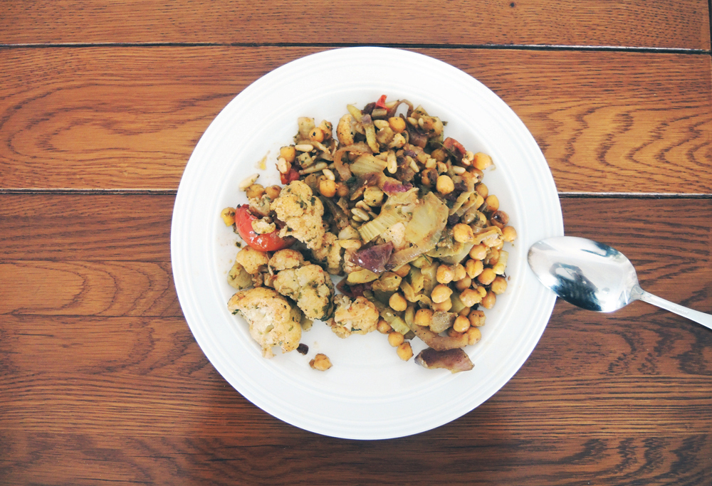 Es gab einen warmen Kichererbsensalat mit Blumenkohl-Tomaten-Gemüse aus dem Kochbuch Vegan vom Feinsten (Nicole Just und Martin Kintrup).